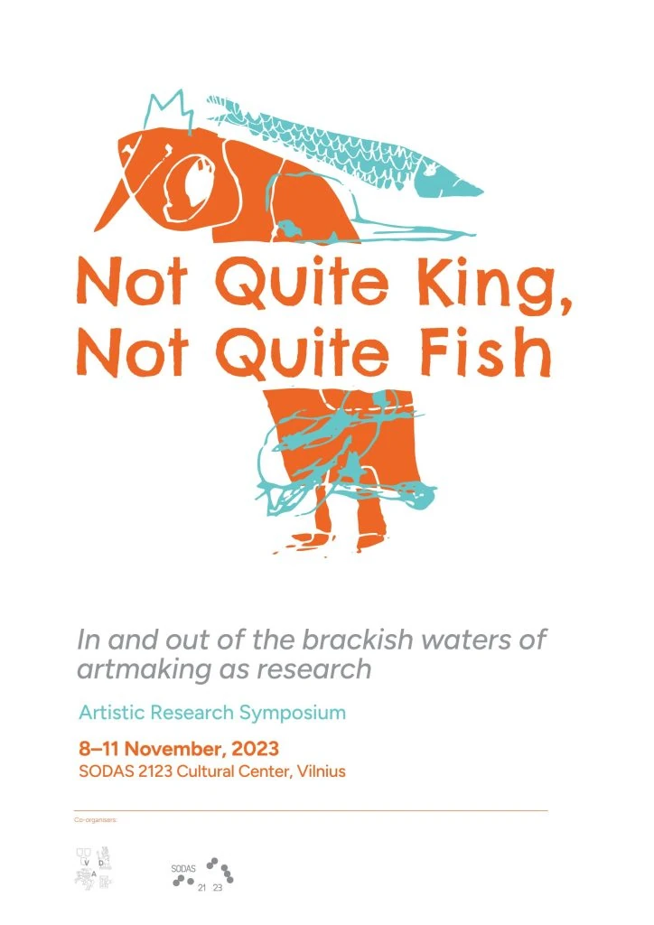 The symposium Not Quite King, Not Quite Fish is a three-day international event for practitioners of fine arts, cinema, dance, architecture and design. The event employs the disciplinary diversity of practice-based artistic research. In this broad field, the real and fictive expectations of artmaking and research occasionally collide and fold into each other. Not quite king, not quite fish, doctoral candidates based in Vilnius have turned to the animal queendom for answers. During the symposium, they will dive into brackish waters like the kingfisher. With contributors from all over the world, the three-day program explores durational and performative forms of presentation and collective experimentation as research.